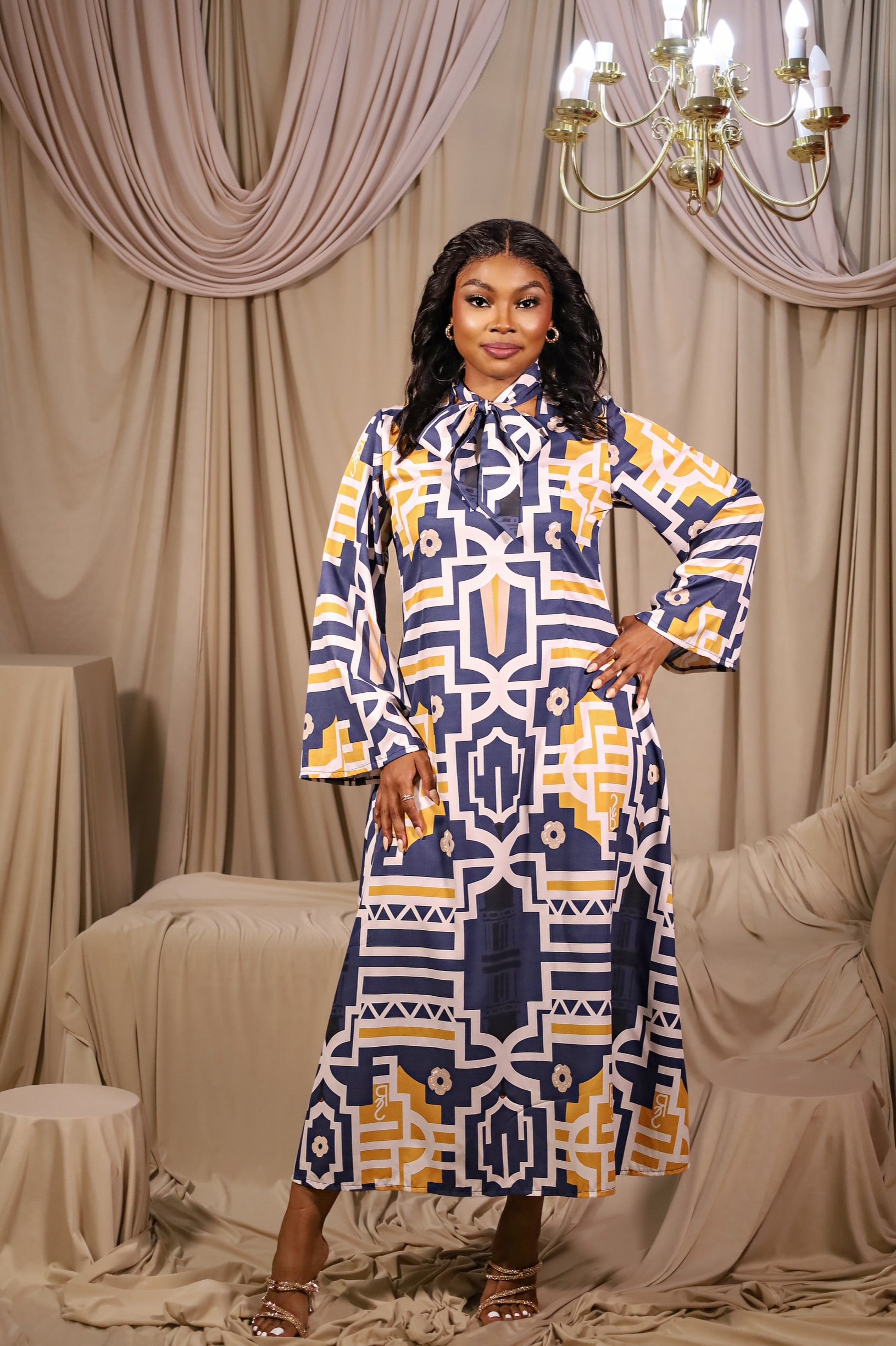 The dress boasts a high neckline with a feminine neck tie detail, long sleeves for a touch of sophistication, and a flowing A-line shape that flatters all figures. Designed for both modesty and statement-making style, it’s perfect for special occasions or stylish everyday wear.