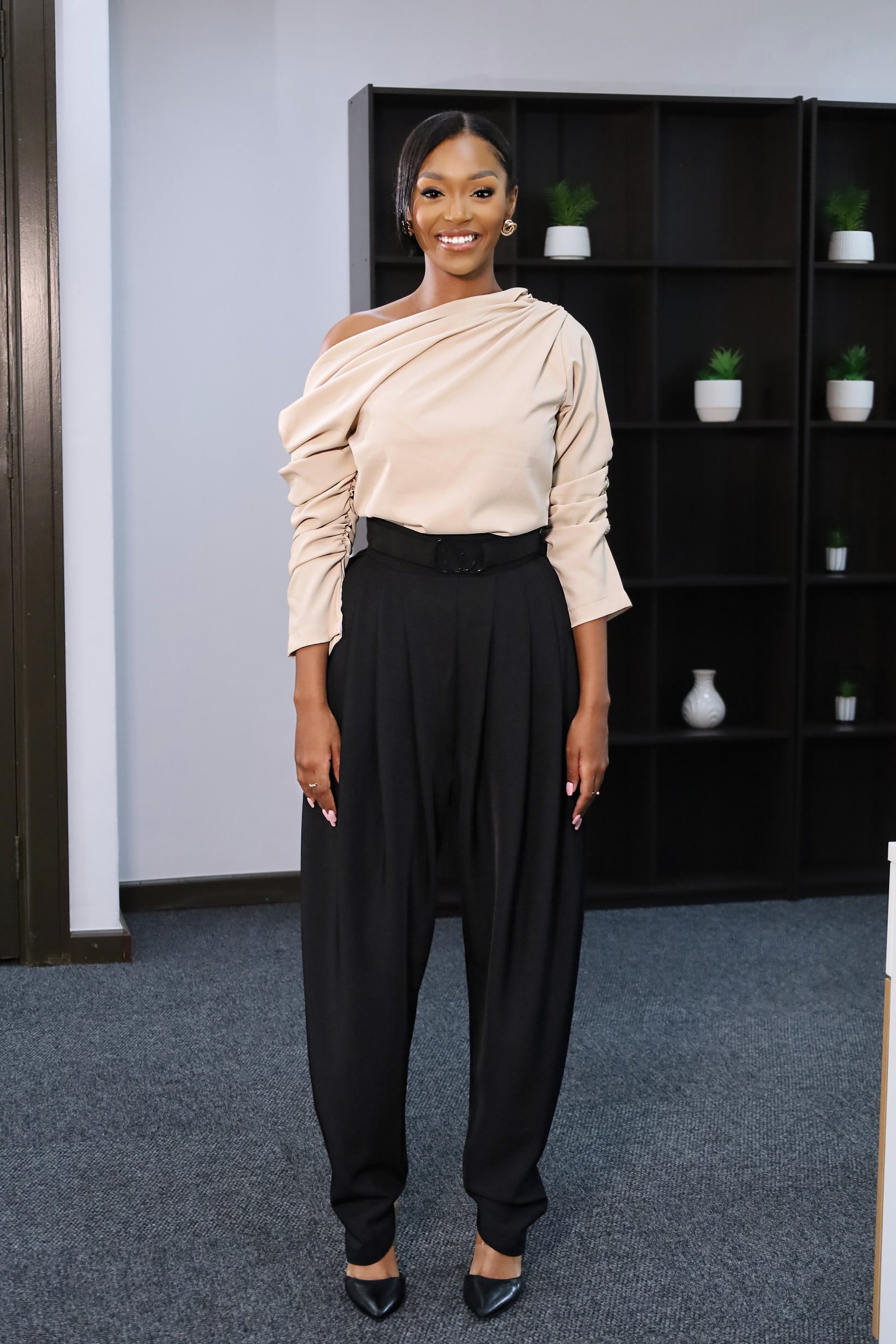 Elevate your wardrobe with the Fabrosanz Black FRS Buckle Aladdin Pants! These unique pants can be paired with a stunning drop shoulder asymmetrical top in cream, complemented by exquisite Nguni print gold buttons on the sleeves.