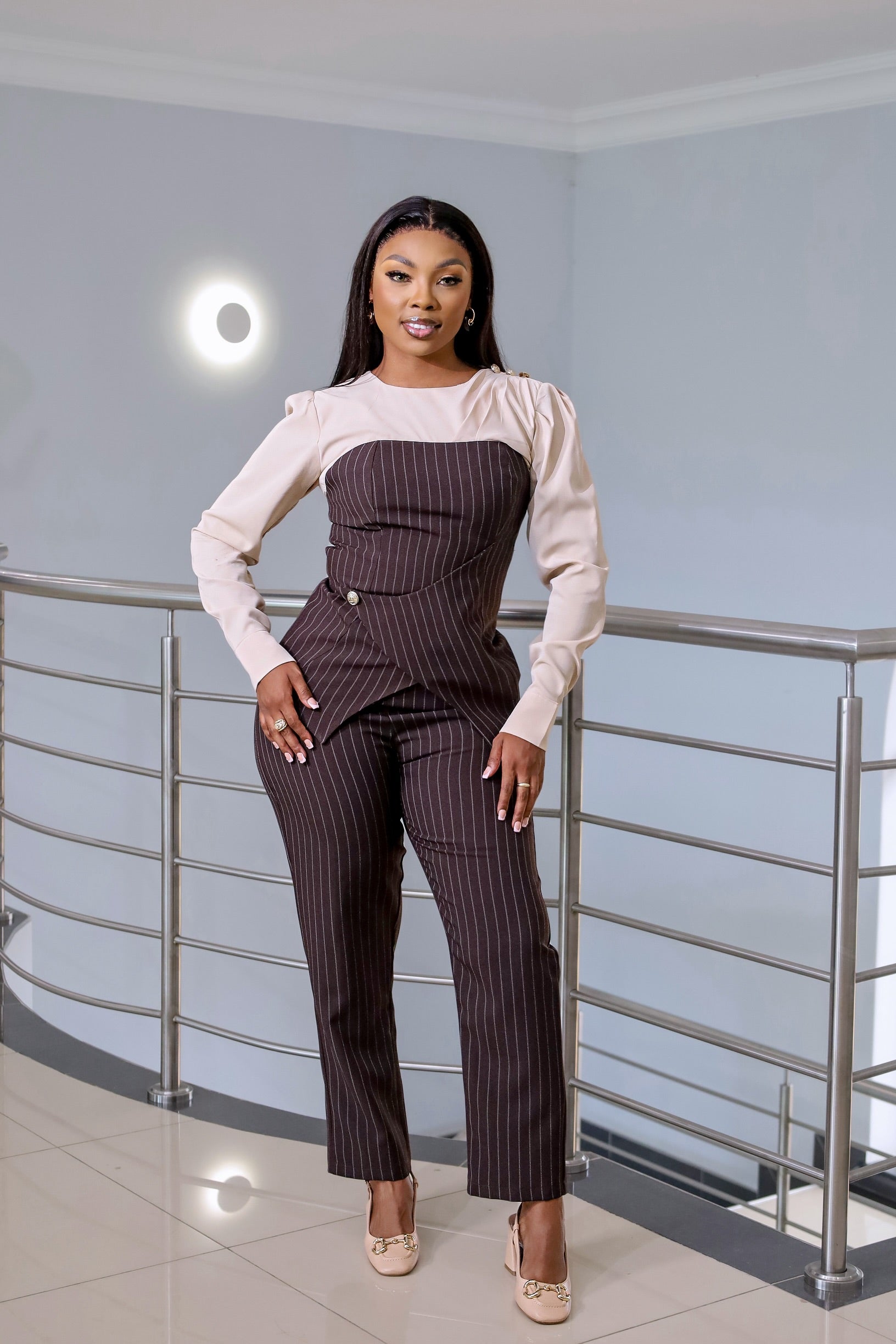 Elevate your style with this brown pinstripe top featuring a chic structured peplum design and a sleek zip closure at the back!