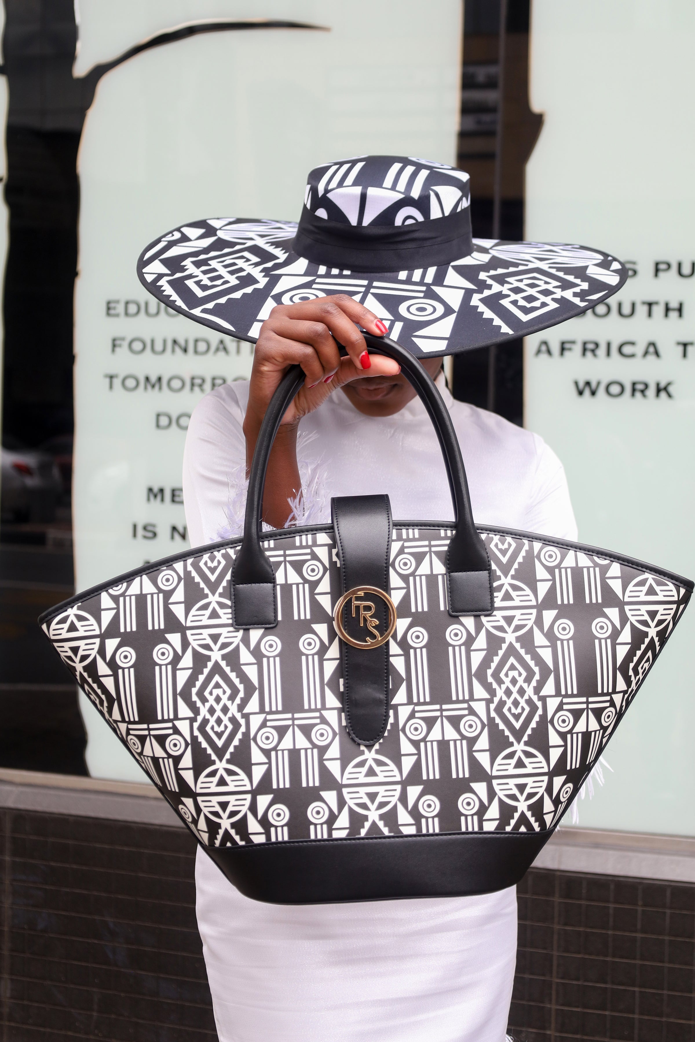 This bag features our timeless Nguni print pattern in black and white, creating a bold and modern aesthetic. The structured silhouette is complemented by sturdy black handles and a sleek black base. A prominent FRS logo embellishment adds a touch of elegance, making it a stylish accessory suitable for various occasions. Its spacious design allows for practicality while maintaining a fashionable edge.