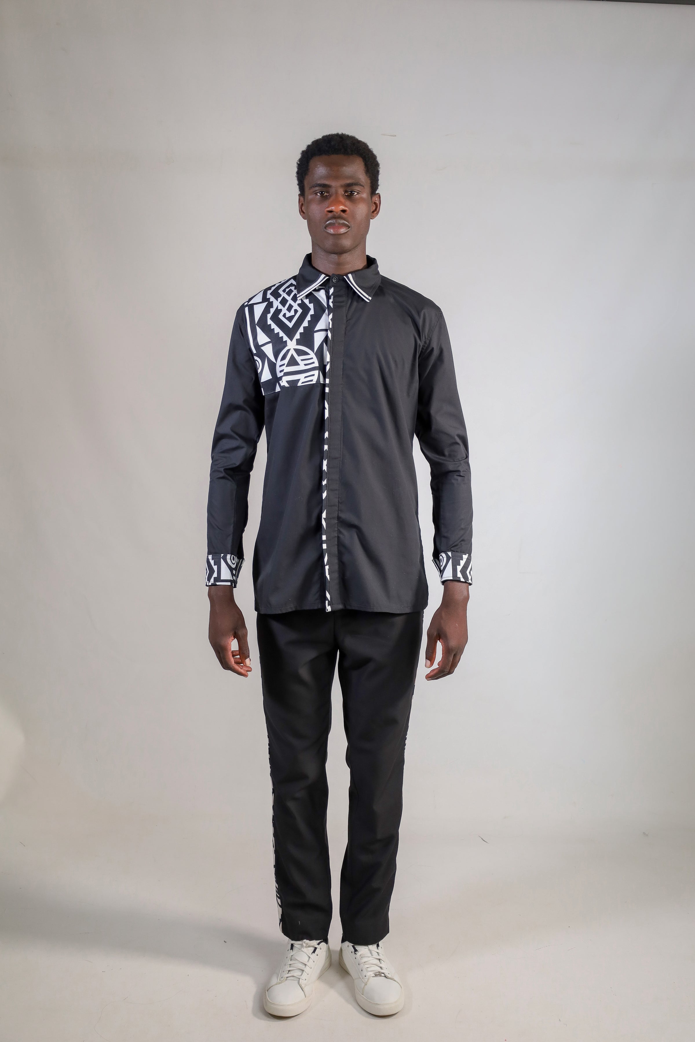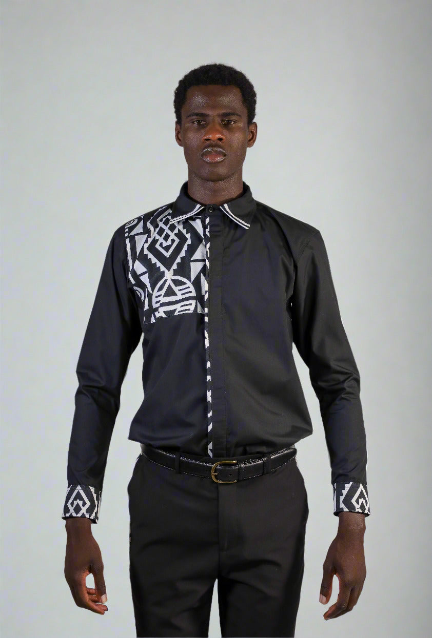 A modern celebration of heritage, this black button-down shirt is elevated with bold Nguni print detailing. Designed for the fashion-forward man who values cultural expression with contemporary tailoring, it’s perfect for events, workwear, and standout everyday style.